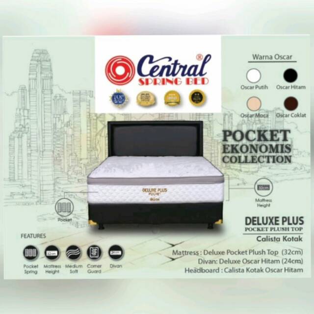 1 set springbed central deluxe plus pocket 160x200 cm dengan divan dan sandaran oscar minimalis hitam kasur tebal 32cm kain kniting halus dan tebal garansi resmi 15tahun tersedia juga yg ukuran 180 x200 bisa bayar ditempat perlengkapan rumah. Free ongkir bisa cod. Belanja central springbed matras deluxe plus pocket plush top indonesia murah belanja kasur di lazada. Kain kniting tinggi.
